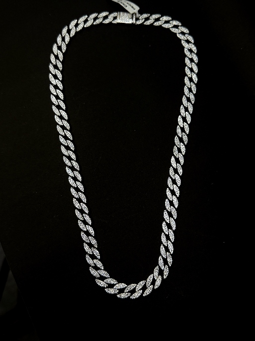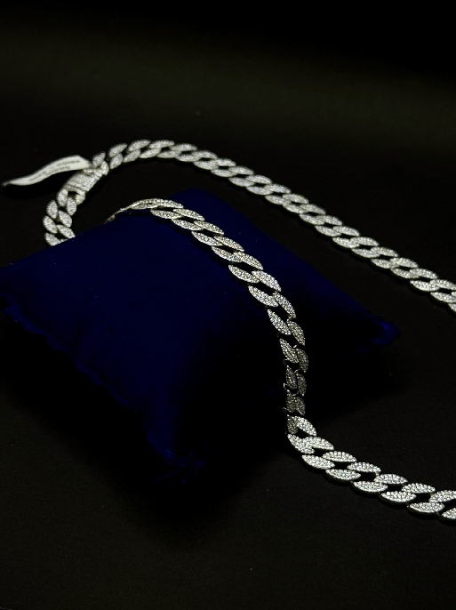 Step into the spotlight with “Ice Moderen Cuban”, a daring and refined Cuban link chain crafted in 925 sterling silver and entirely pavéd with premium VVS-grade cubic zirconia stones. Each link captures light with laser-like intensity, creating a continuous blaze of brilliance.